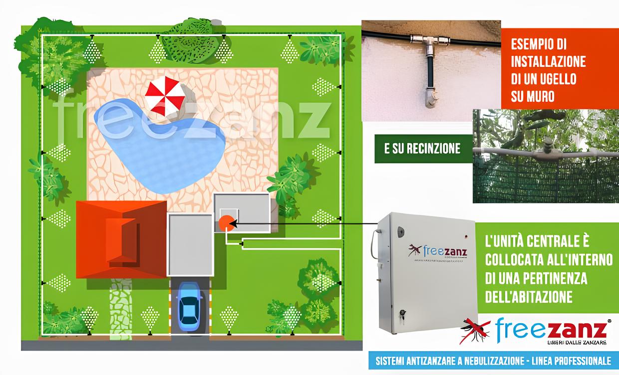 L’impianto antizanzare Freezanz crea una barriera protettiva grazie a una rete perimetrale con ugelli nebulizzatori, che allontana e impedisce l’ingresso degli insetti. È modulare e adatto anche a grandi superfici (oltre 10.000 mq), utilizza pochissimo prodotto e può essere programmato per funzionare in orari non frequentati, rendendolo ideale anche per ambienti pubblici.